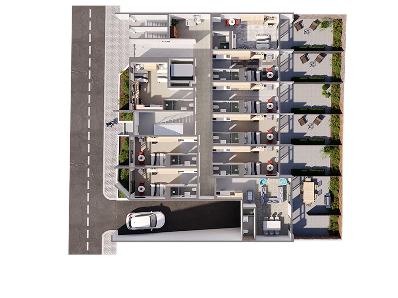 -Onsite storage room and gym + parking for motorbikes and bicycles and cars