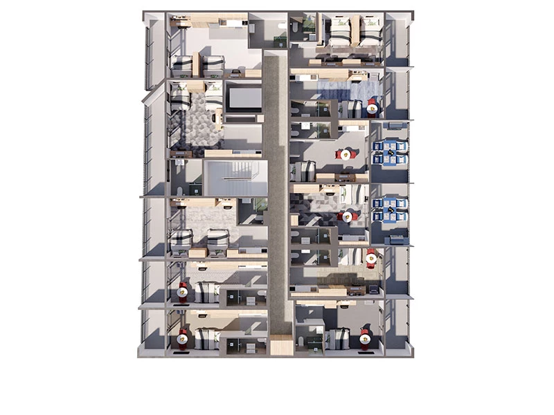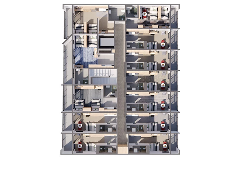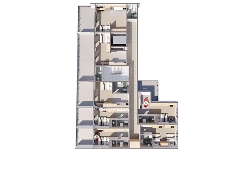 Our spacious rooms are designed to an exceptional standard with premium finishes throughout whilst optimising privacy and comfort, the generously sized studios range from single rooms measuring 26sqm to 37 sqm and twin-share from 26sqm to 43 sqm. Each studio at the Castle is carefully curated to perfection, offering all desirable must-haves, varying from ample balconies and large windows to a gourmet kitchen containing gas cooktops, microwaves and a full-sized fridge. As well as our developers maximising the open space to offer each student a custom made built-in wardrobe, study desk and 42 inch TV ( Single Room ), alongside a sleek modern bathroom with fine vanities.