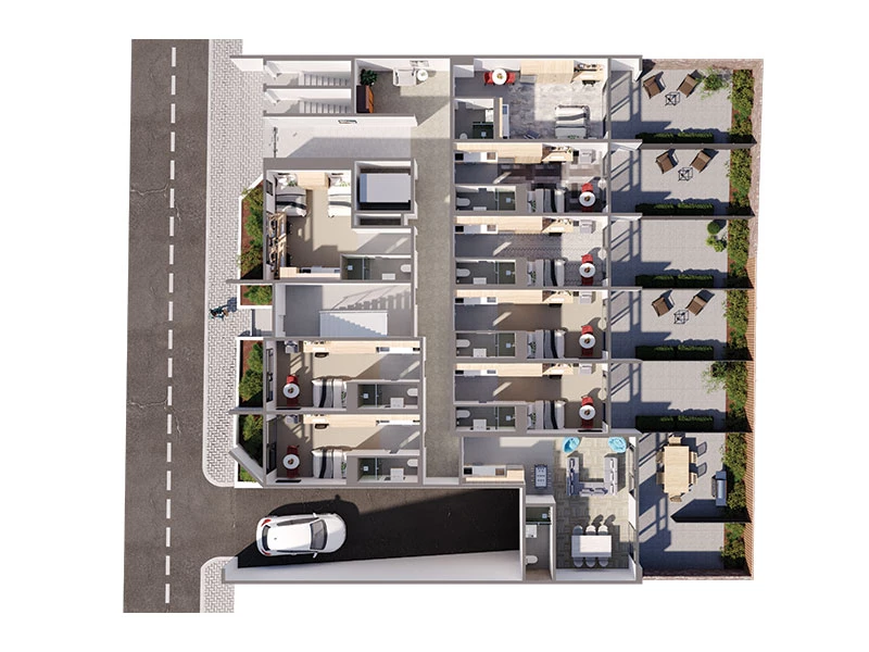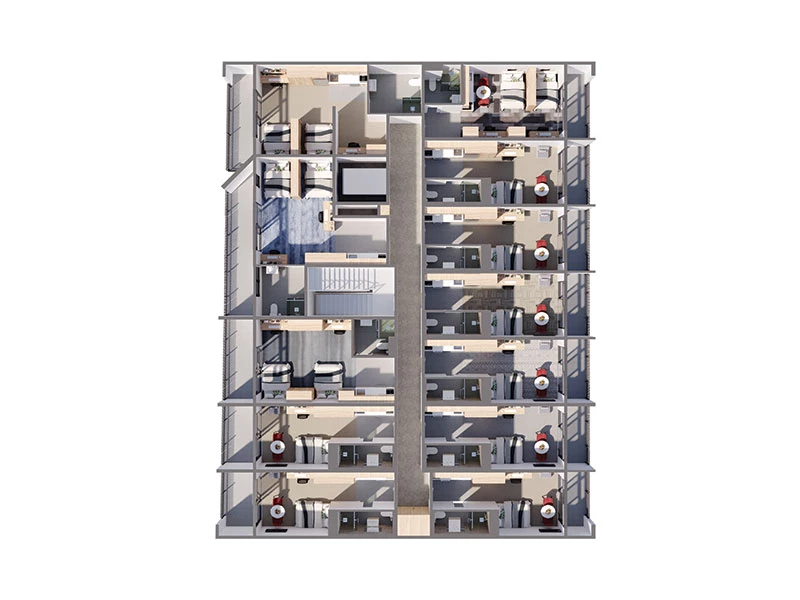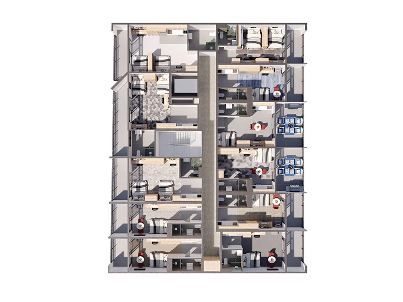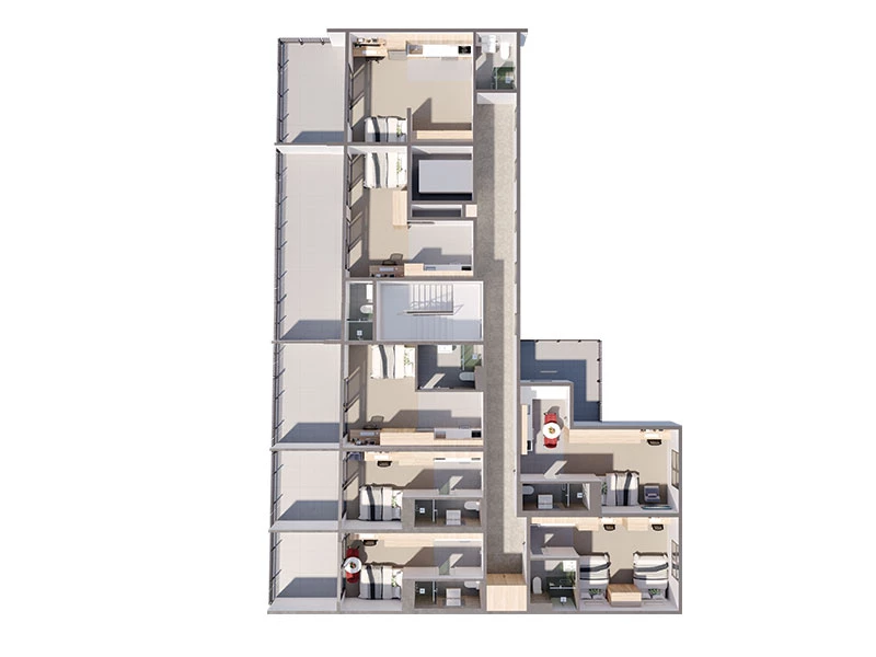 Our spacious rooms are designed to an exceptional standard with premium finishes throughout whilst optimising privacy and comfort, the generously sized studios range from single rooms measuring 22sqm to 28 sqm and twin-share from 26sqm to 53sqm.
