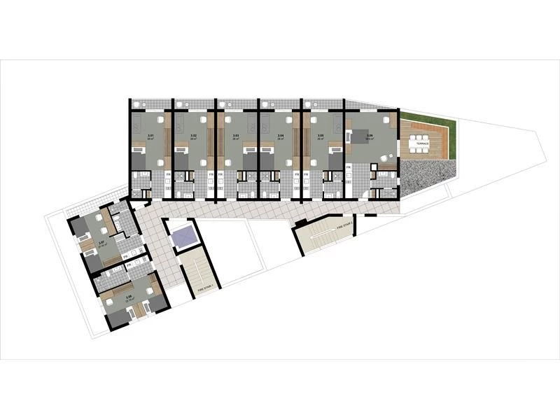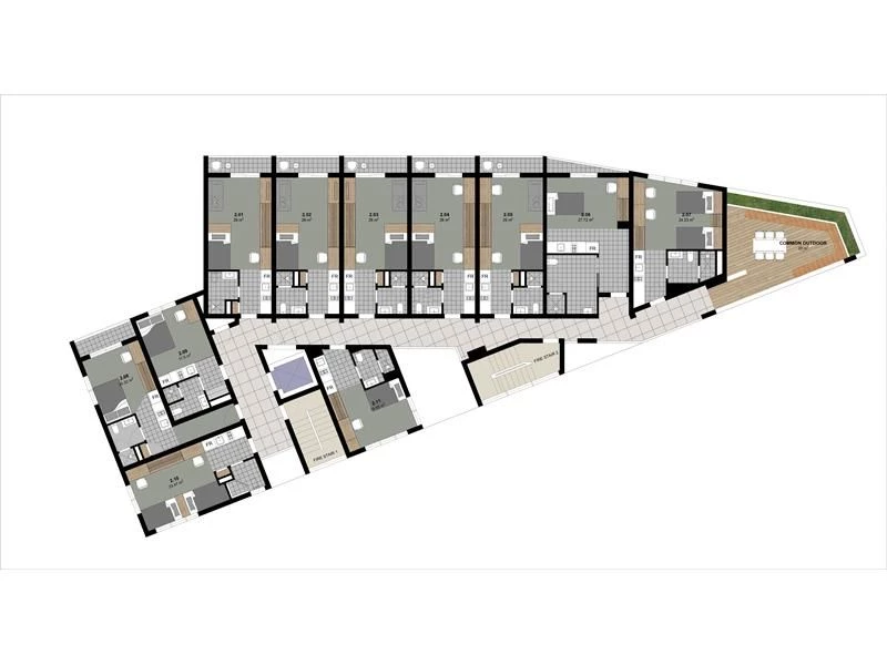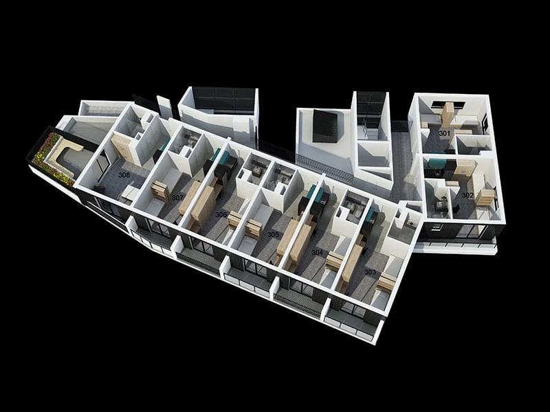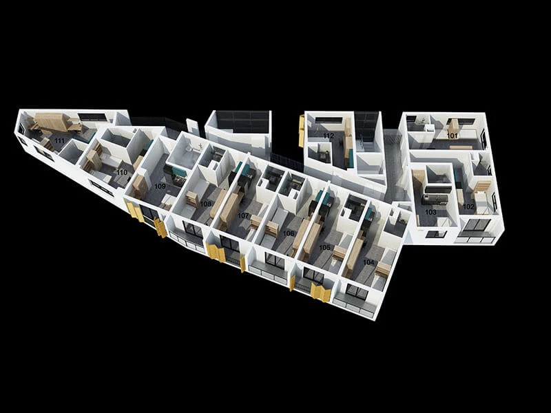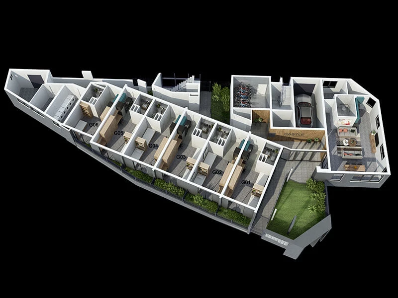 Our spacious rooms are designed to an exceptional standard with premium finishes throughout whilst optimising privacy and comfort, the generously sized studios range from single rooms measuring 22sqm to 26 sqm and twin-share 26sqm, Each studio at the Castle is carefully curated to perfection, offering all desirable must-haves, varying from ample balconies and large windows to a gourmet kitchen containing a gas cooktop, oven, microwave and full-sized fridge. As well as our developers maximising the open space to offer each student a custom made built-in wardrobe and study desk, alongside a sleek modern bathroom with fine vanities.