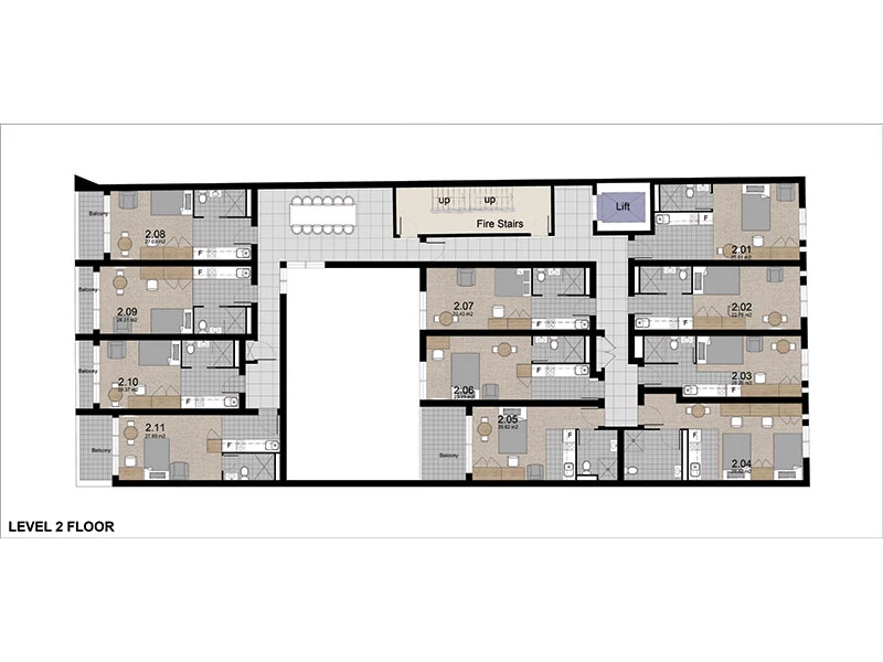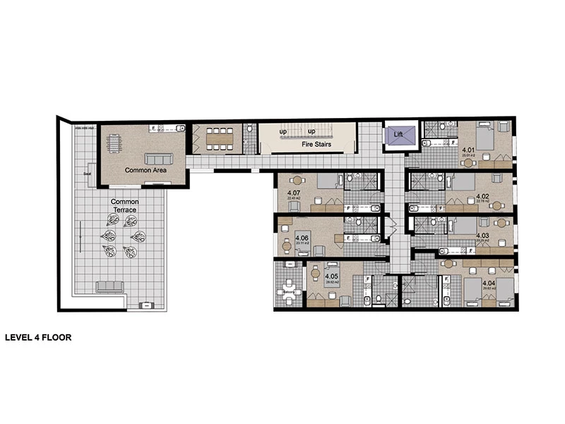 Our spacious rooms are designed to an exceptional standard with premium finishes throughout whilst optimising privacy and comfort, the generously sized studios range from single rooms measuring 26sqm to 37 sqm and twin-share from 26sqm to 43 sqm. Each studio at the Castle is carefully curated to perfection, offering all desirable must-haves, varying from ample balconies and large windows to a gourmet kitchen containing gas cooktops, microwaves and a full-sized fridge. As well as our developers maximising the open space to offer each student a custom made built-in wardrobe, study desk and 42 inch TV ( Single Room ), alongside a sleek modern bathroom with fine vanities.