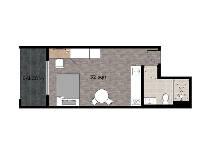 Our spacious rooms are designed to an exceptional standard with premium finishes throughout whilst optimising privacy and comfort, the generously sized studios range from single rooms measuring 26-32sqm and twin-share approx 40sqm. The entire building was recently constructed to perfection, utilising each individual room’s floorboards, greatly desired high ceilings, sun-filled and spacious balconies, and double-glazed windows.