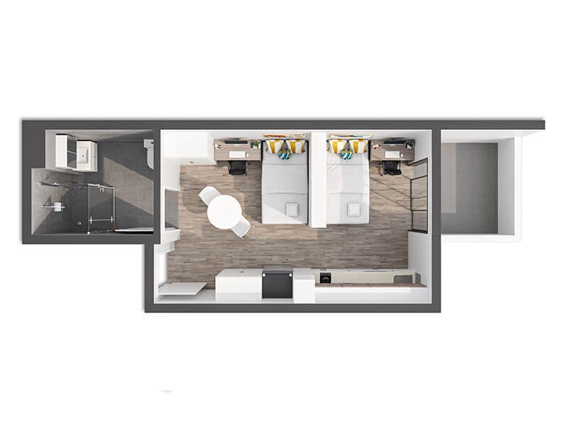 You want bigger, better, best, then this deluxe apartment is the ultimate choice. A stylish, cost effective rental option in luxury boutique student accommodation, this fully furnished, this 40sq twin share studio is perfect if you want to share with a friend, sibling or meet new people. It has two single beds separated by a dividing wall/bookshelf, a deluxe stone/gas kitchen, plus fitted study desks, a balcony