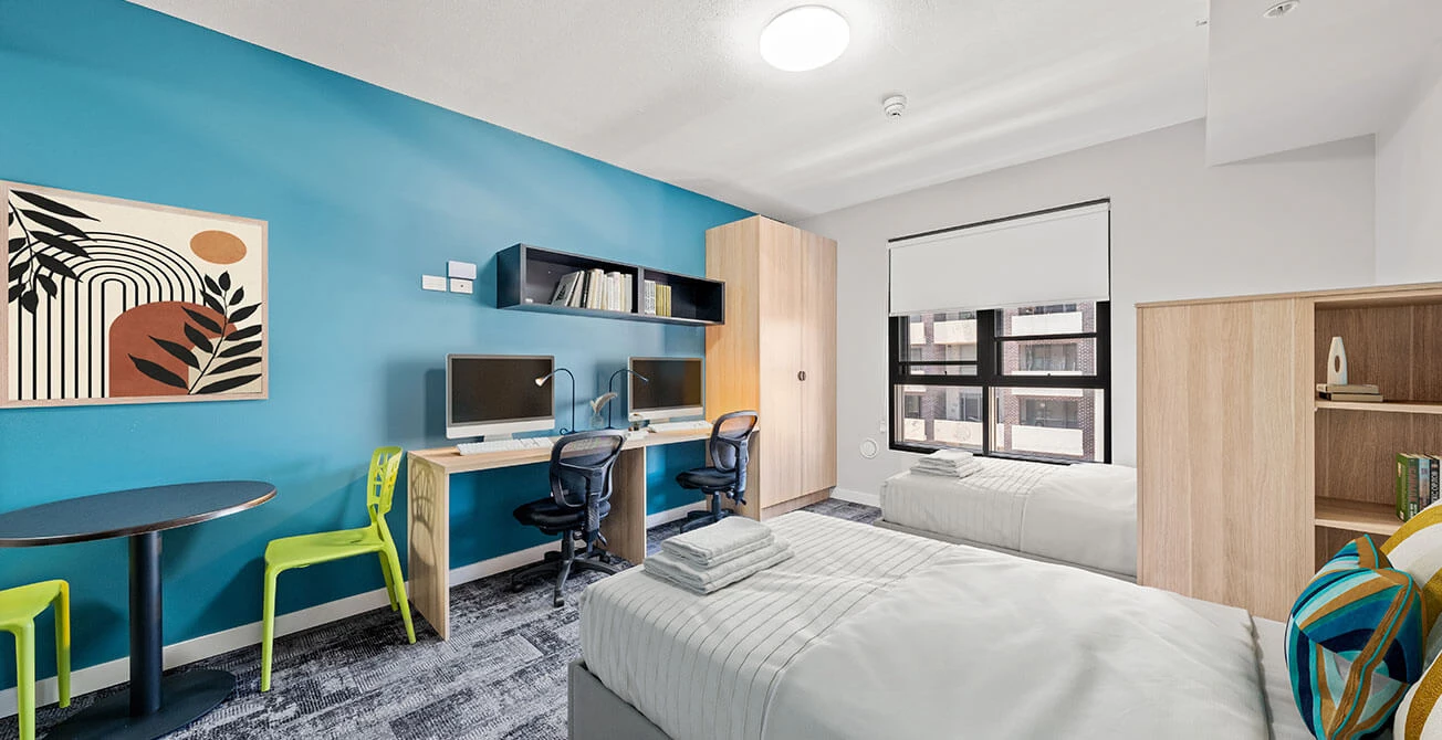 Perfectly located just 650 metres from Sydney University, these brand new fully furnished apartments have been expertly designed to provide the ultimate living-away-from-home experience. Built to an exceptional standard with premium finishes throughout, each room has individual heating & cooling, a quality kitchen and ultra high 1,000mb WiFi connectivity, while many have a balcony and city skyline views. Residents enjoy access to superb onsite facilities including communal study zones on each floor, a TV room and central garden/rooftopbarbecue area, as well as bike storage, a gymnasium and 24/7 security.